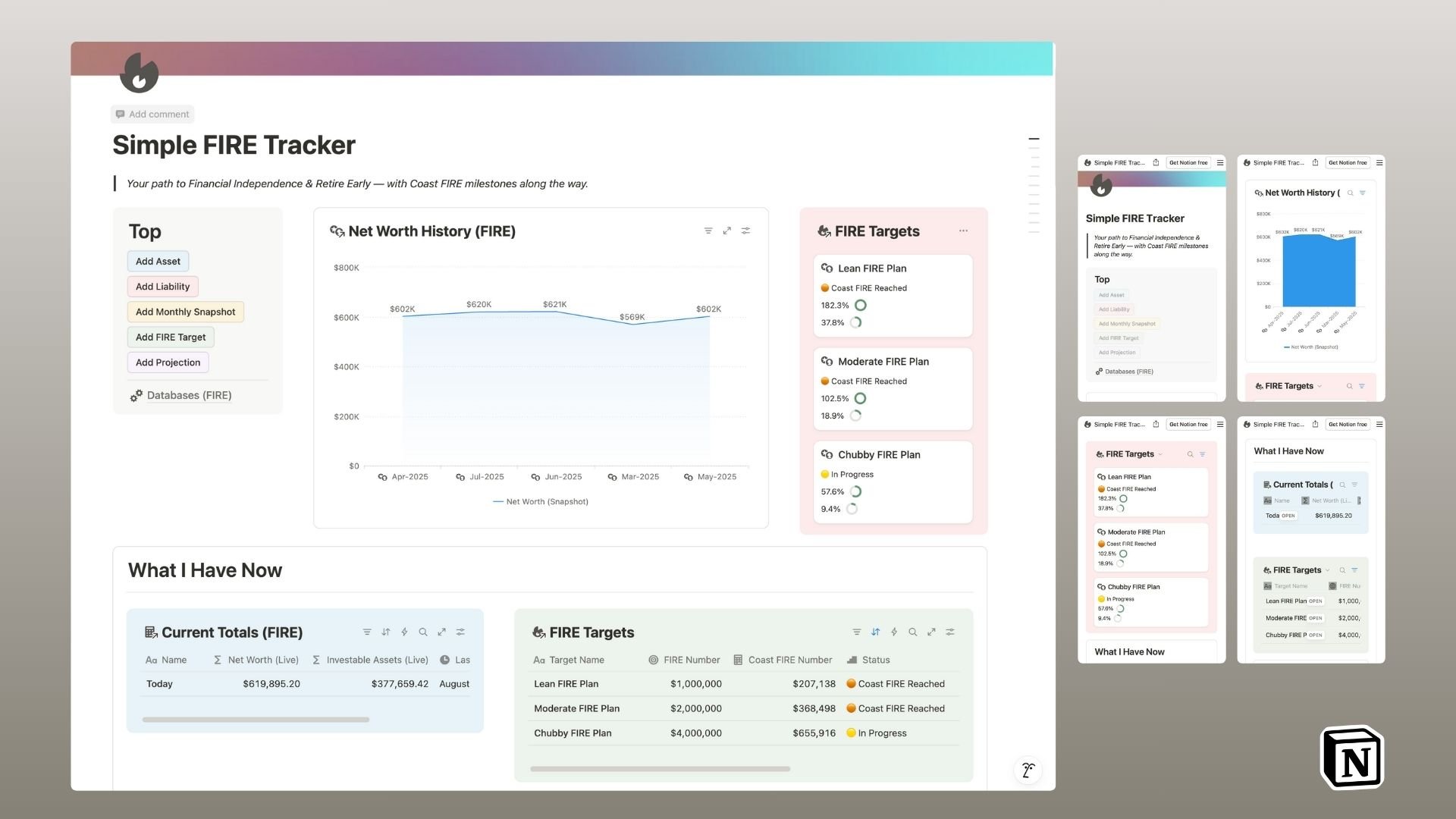 Whether you’re exploring Coast FIRE or aiming for full Financial Independence, this Notion template gives you a clear view of your progress — all in one place.