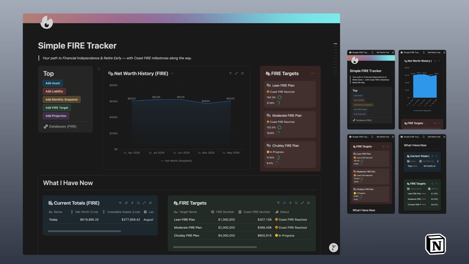 Track your Coast FIRE and FIRE journey in Notion — complete with net worth logging, projections, and visual dashboards.
