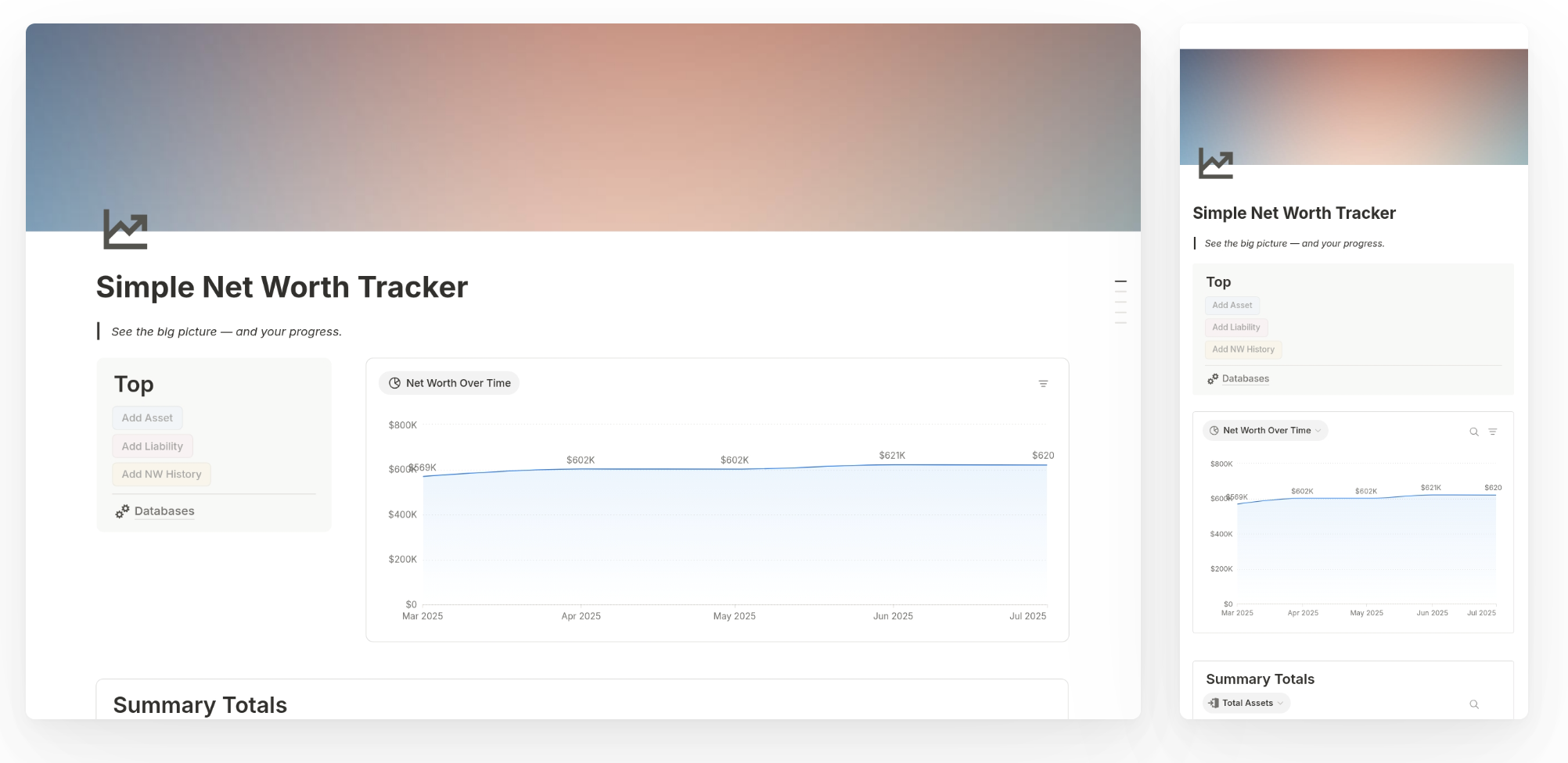 See the big picture — and your progress. A clean, no-fluff Notion template to track your net worth over time.