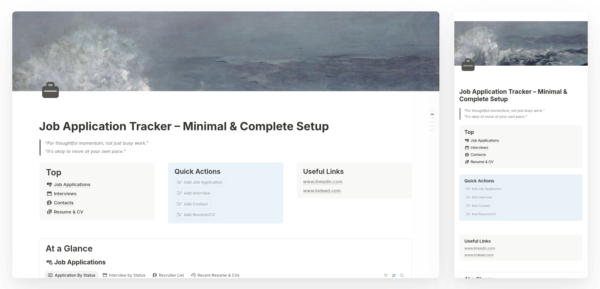A structured, minimal Notion template to manage job applications, interviews, contacts, and resumes.