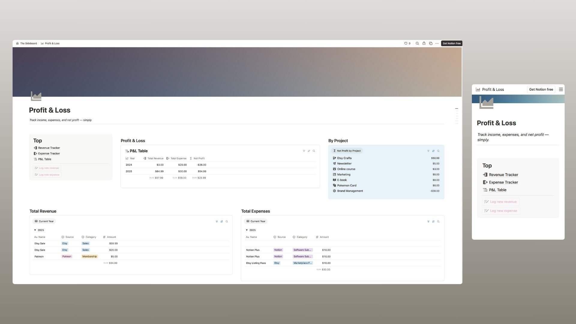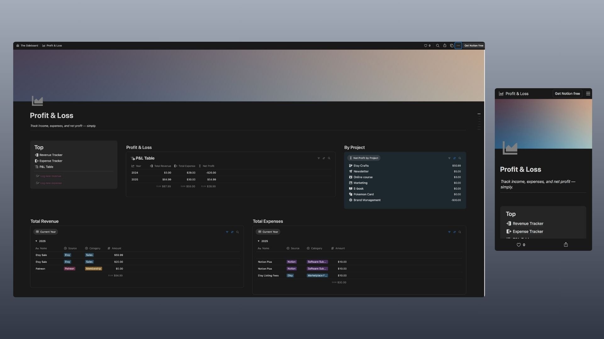 I also created a free template called Side Hustle Profit & Loss. It’s a simple, standalone P&L dashboard that focuses on income, expenses, and net profit by year.